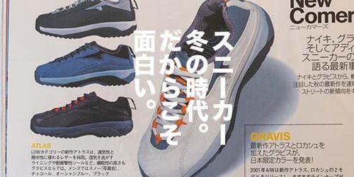 ”ナイキ、グラビス、そしてアディダス”とあるように、スニーカー特集でアディダスを抑え、ナイキに次ぐ2番手というポジションでグラビスが紹介されているということから、当時の人気の高さが伺えます。
