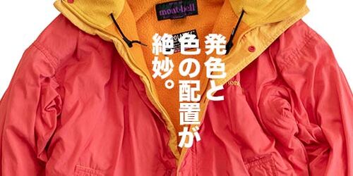 やっぱりヴィンテージモンベルの魅力は配色の良さ。一着に多彩な色を使って美しいハーモニーを生み出す服もありますが、このジャケットに使われているのはピンクとイエローの2色のみ。ですが、その発色と色の配置が絶妙なんです。