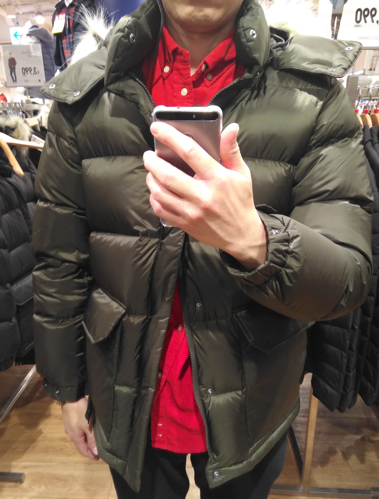 そういや今年のダウンはまだ着たことがなかったことに気付いたので試着してみました。生地の光沢感と色があまり良くないですね。着用したオリーブが唯一良さげな感じでした。