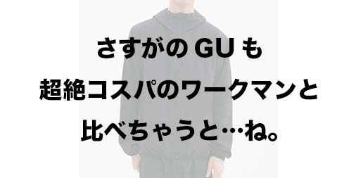 3,990円のシンプルなデザインのウィンドブレーカーです。悪くない商品なんですが、ワークマンのコスパの高さを知ってしまうとGUのこういった商品には魅力を感じられなくなってしまいますね。