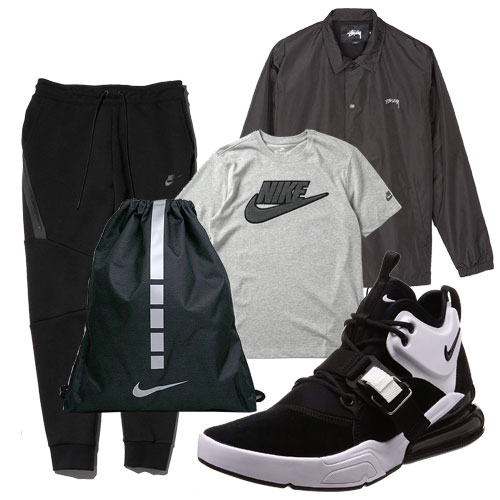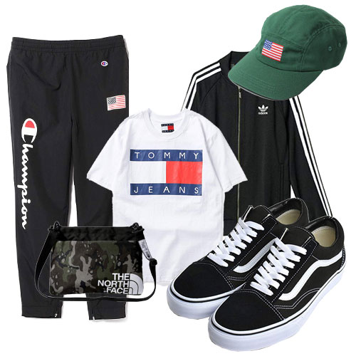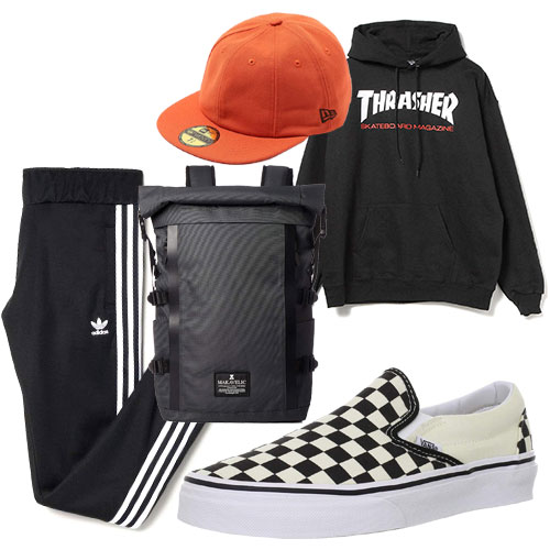 まずは黒を基調としたそれぞれのアイテムのロゴが目立つコーディネート。