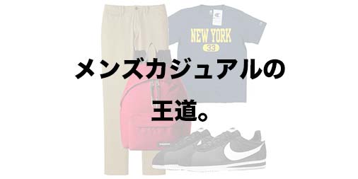まずはカレッジロゴTシャツとチノパンツの、これぞ「アメカジ」!なコーディネート。
