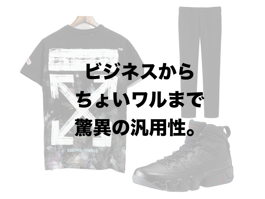 当ブログや「男の普通服。」ではネイビーを最も汎用性の高いパンツの色としてオススメしていますが、後々ご紹介する「ラグジュアリーストリート」などの男っぽさが強いファッションテイストには、ブラックのほうがマッチするので今回はブラックを使います。