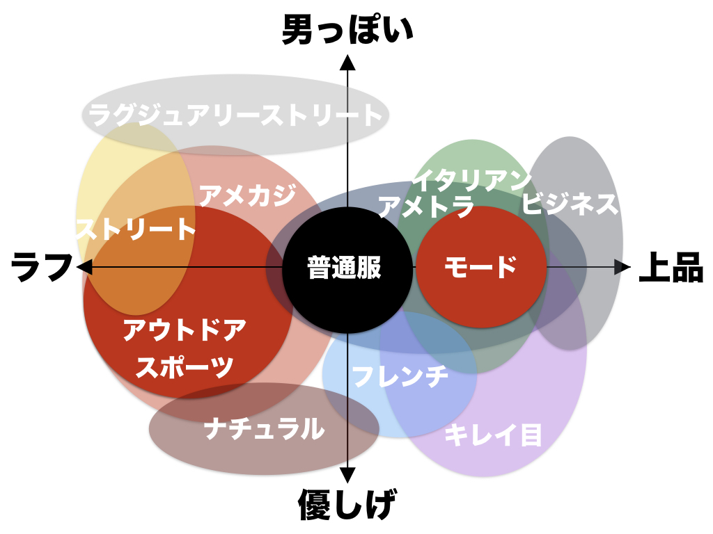 ファッションには「ファッションテイスト」という、料理に例えると、和食や中華、フレンチのような「種類」があります。この↓画像に表記しているファッションテイストはごく一部。他にも無数のファッションテイストがあります。
