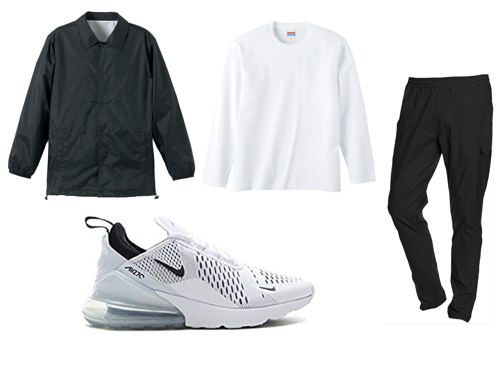 アウターもスポーツ要素のある黒のものにすると、更に馴染みます。素材はナイロンなどの、光沢感があるものがオススメです。