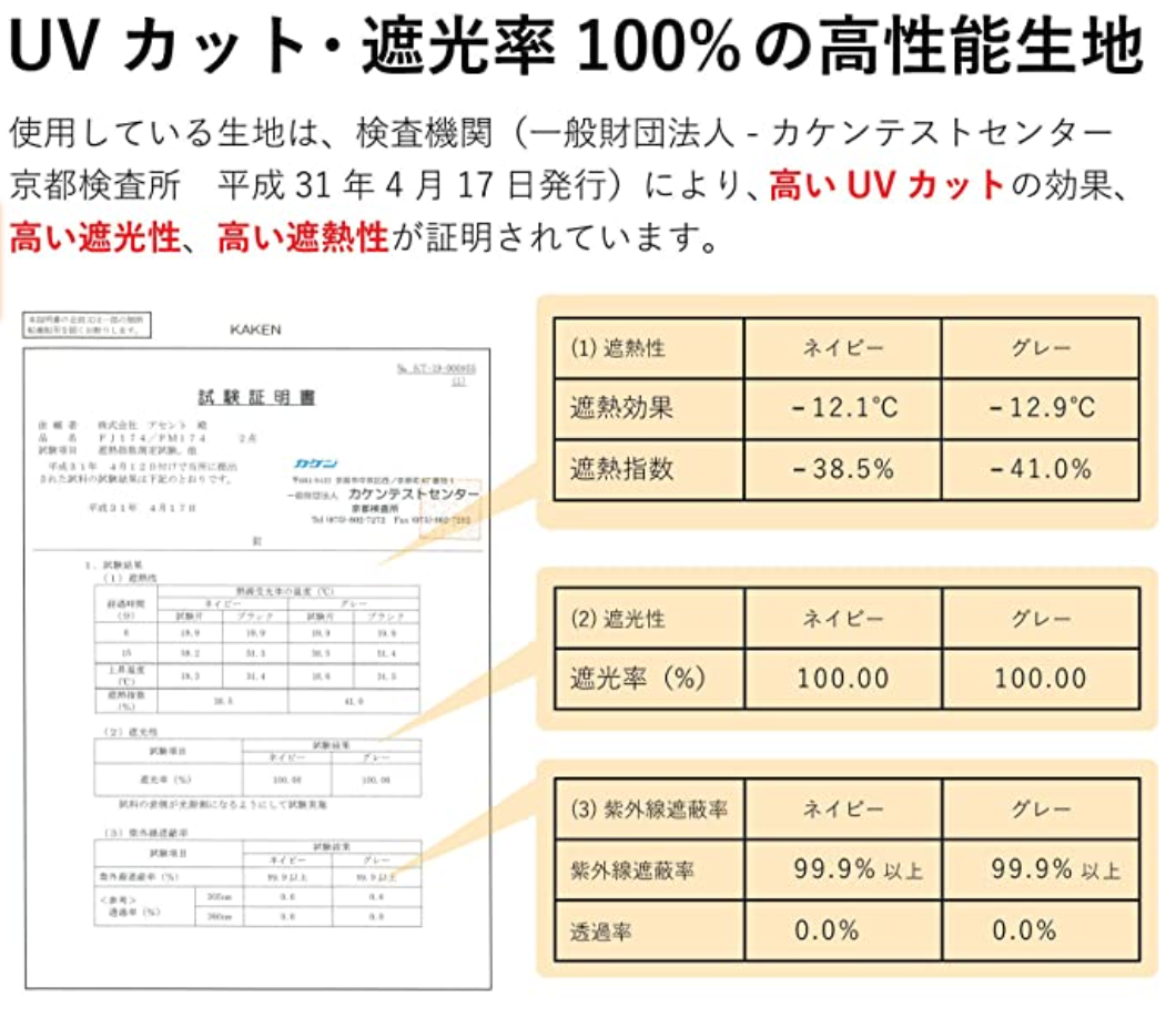 UVカット、遮光率ともに99.99%以上で、こちらの商品説明画像では100%を謳っています。