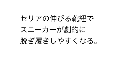 脱ぎ履きがしやすいということは靴を長持ちさせることに繋がります。スニーカーを買った当初は大事に履こうと思っていても、「今は急いでるからまぁいいか」ってな感じでカカトを踏んで歩いてしまう、なんてことも少なくないですが、この靴紐に替えるとそのようなことはなくなります。また、履くときも靴に無理な力がかからなくなるので靴へのダメージがかなり減らせるようになると思います。