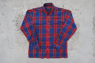 こちらは「チェック柄」、「ボタンダウン」、「カラーボタン」いうデザインが加えられたシャツです(裾の形など細かく言えばもっとありますが)。