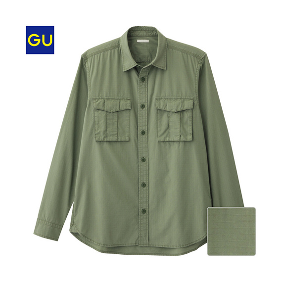 悪くはないのですが、あと一歩、なのがこちらのシャツ。GUのシャツは生地のクオリティがイマイチな商品が多いのですが、これはなかなかのクオリティ。なので僕もお店で見たときは「おっ、ついにGUでシャツを買うときがきた!」と一瞬思ったのですが、襟のステッチがなかったり、一部のボタンがくるみボタンになっていたりと地味なところでデザインが加えられていました。若い人にはいいかもしれませんが、36歳の僕が着るのにはちょっと厳しいアイテムでしたね。