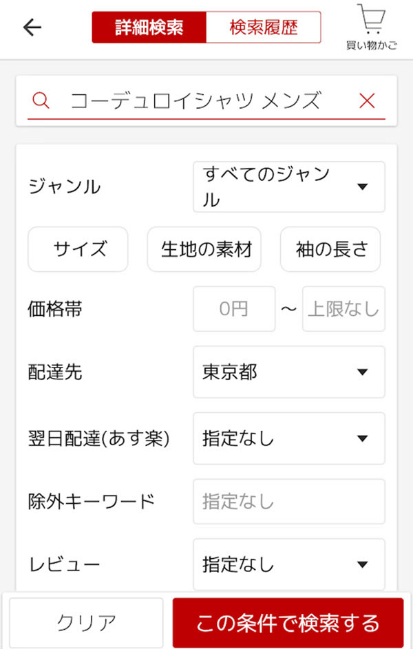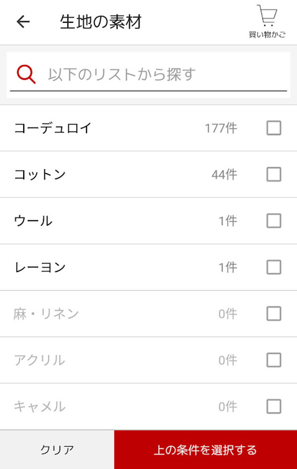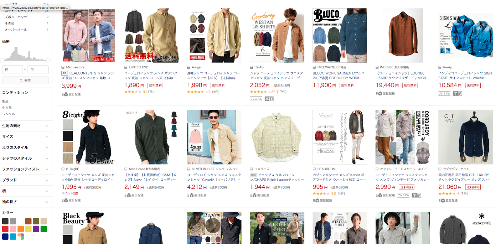 と、これだけでもかなり便利ですが、PCのブラウザだともっと細かく絞り込みができます。先程と同じように「コーデュロイシャツ」で検索をかけました。左側で絞り込みができます。