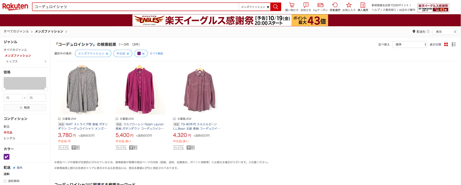 ですが、実際に古着屋さんに足を運んで目当ての商品をディグるとなると、相当な時間が必要ですよね。しかも紫のコーデュロイシャツなんてあまり売ってなさそうですし。