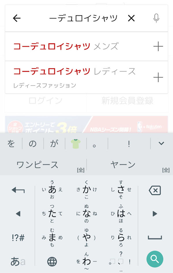 楽天市場のスマートフォンアプリで実際に検索してみましょう。まずは検索窓に「コーデュロイシャツ」と入力。「コーデュロイシャツ メンズ」を選択。
