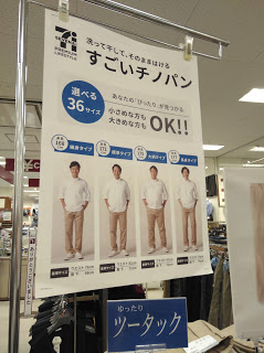 サイズ展開豊富なチノパンツ。ユニクロもパンツのサイズは豊富ですが、ファッション性を追求せず、こうやってわかりやすいビジュアルで訴求できるのはイトーヨーカドーの強みですね。ユニクロはどうしてもスタイリッシュさを求めてしまうので、こういった親しみやすさは出しづらくなってしまいます。