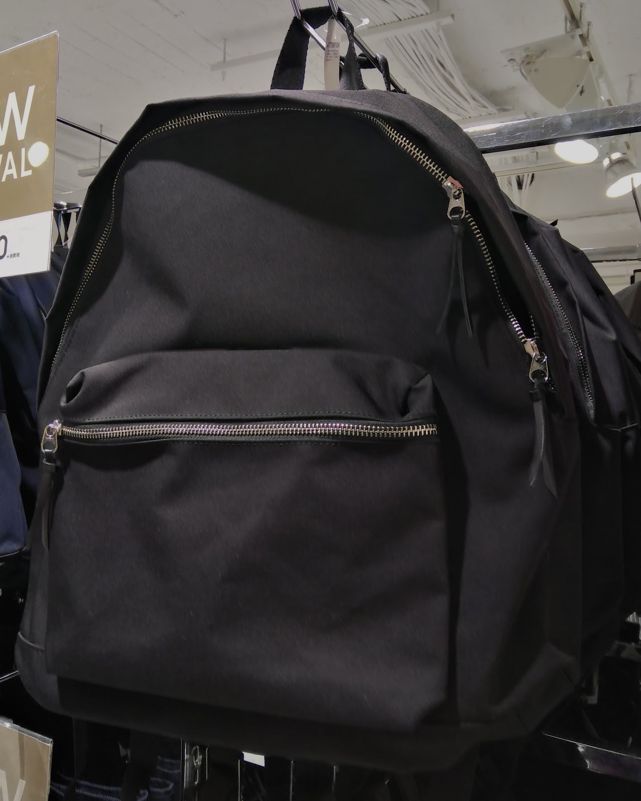 また、こちらも以前の記事でご紹介したビームス別注のオールブラックの商品も、実際に背負ってみるとアウトドアっぽ過ぎて、テーラードジャケットなどのキレイ目のアイテムには馴染みにくいように感じました。