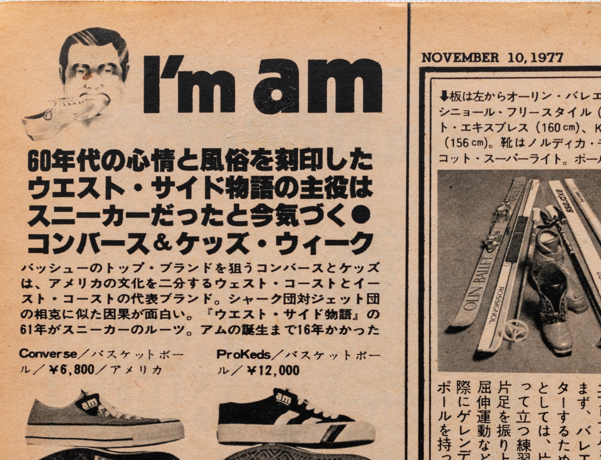 「アム・スポーツ・フットウェア」というお店の広告で、その冒頭には「60年代の心情と風俗を刻印したウエスト・サイド物語の主役はスニーカーだったと今気づく・コンバース&ケッズウィーク」と記されています。下には「「ウエスト・サイド物語」の61年がスニーカーのルーツ」とも。