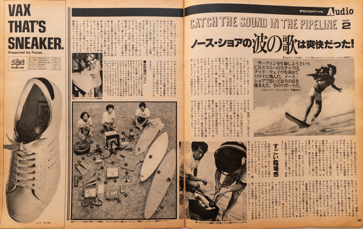 モノクロページの「ノース・ショアの波の歌は爽快だった!」というサーフィンの記事横に、スニーカーの広告。