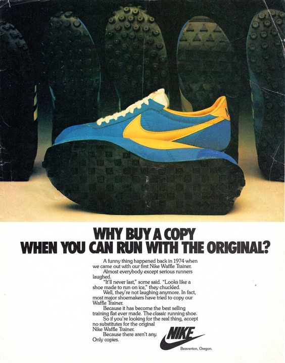 ワッフルレーサーの特徴は、ビル・バウワーマンがワッフルの焼き器から着想を得たという、ワッフルソール。ワッフルソールはその後ナイキを象徴するディテールとなり、コピー商品を牽制するこんな広告もつくられていたようです。