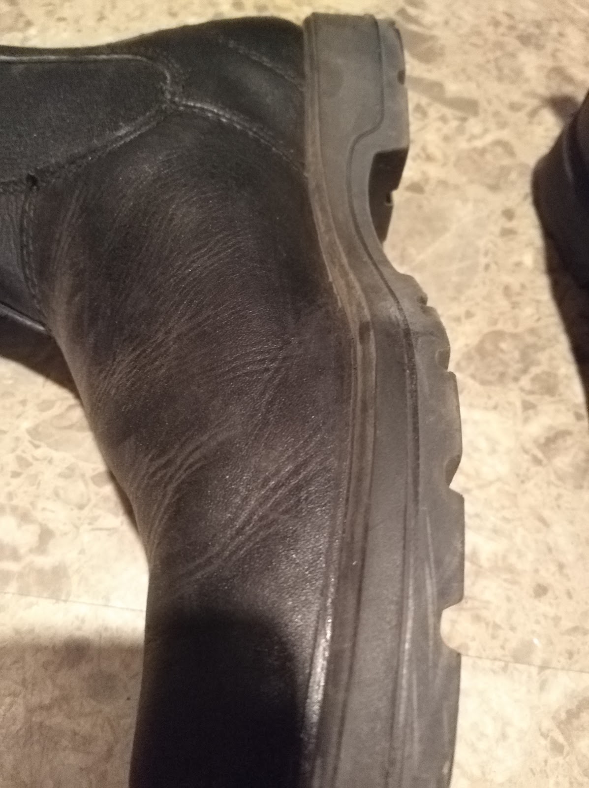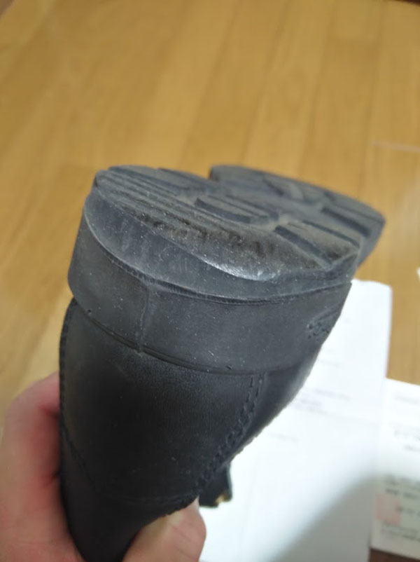 本当はヤスリがあったら表面を綺麗に整えられたのですが、なかったのでこのまま着用しています。数回履くと、このテカリもなくなって馴染みます。もちろん履き心地などに変化はありません。年に1度くらいこうやってソールの減りを補修していったら、かなり長い年月穿き続けられそうですね。