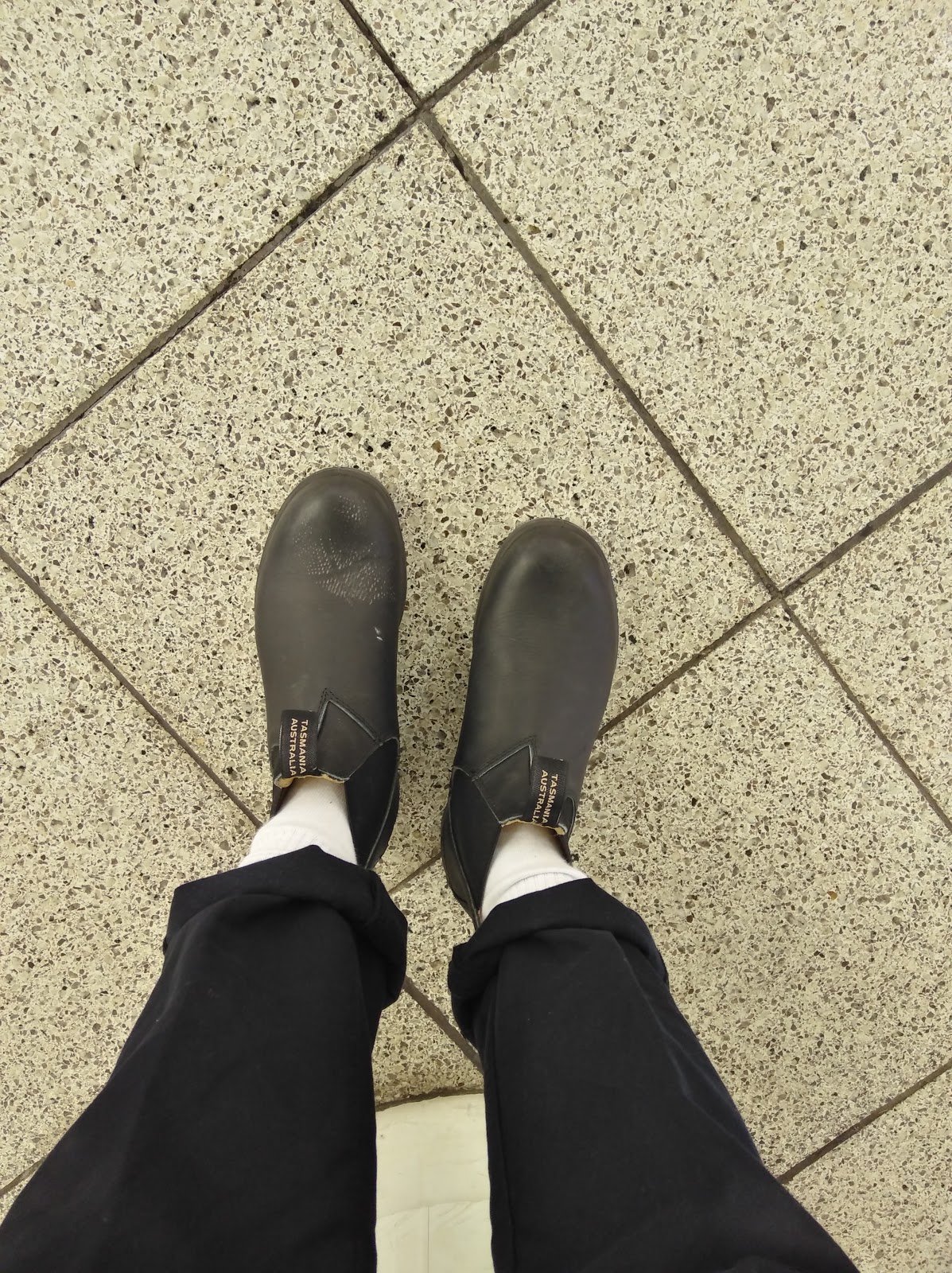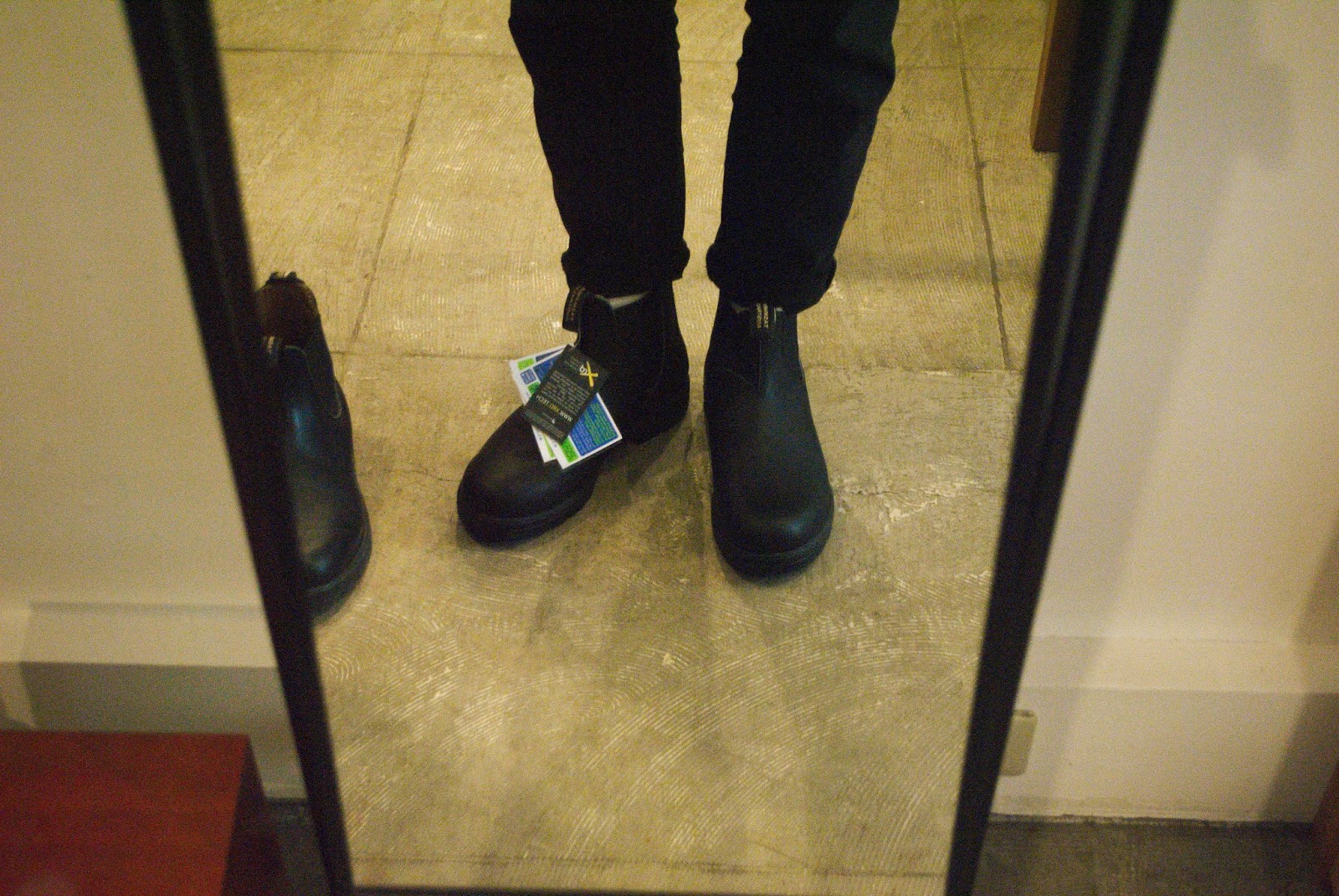 ですので、20年近く愛用しているコムデギャルソンオムプリュスのジャケットを着て、お店に行きました。で、Blundstoneを履いて自撮り。相性は全く問題ありませんでした。パンツはグンゼレギンスパンツです。