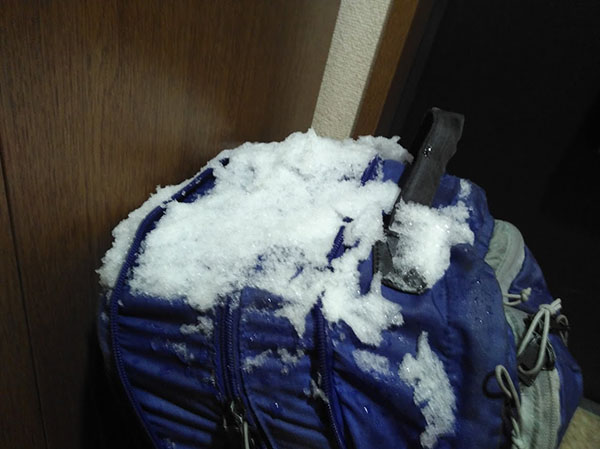 5歳長女と2歳長男を連れて帰宅。やはり子連れでしかも雪が積もっているとかなり時間がかかります。家に着いたら、バックパックにこんなに雪が。