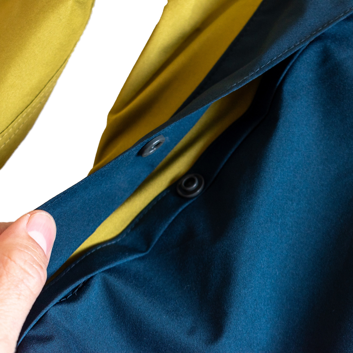 このスライダーを首元まで上げると、ガバっとマチが広がるのです。これが「BAG IN」。つまり、バックパックを背負った上から羽織れるレインジャケットなのです。
