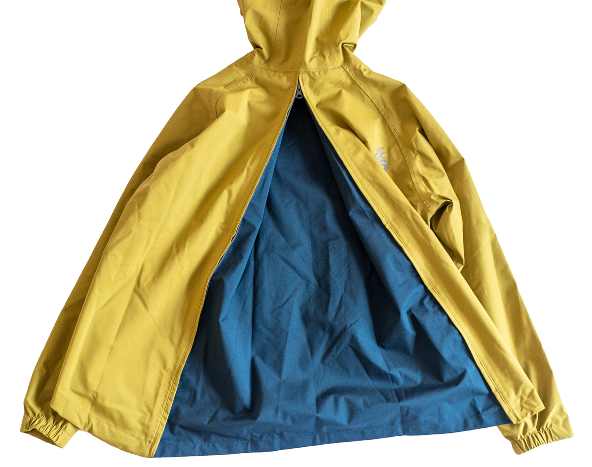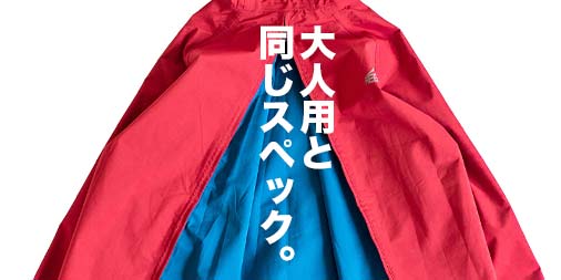 レインジャケットということで、一番重要になる防水透湿性は、耐水圧10,000mm、透湿度5,000g/m2/24hと、大人用と全く同じスペックです。