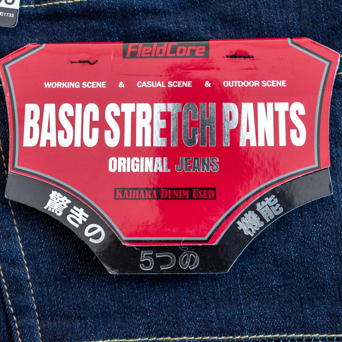 「BASIC STRETCH デニムウォームパンツ」に付いているフラッシャーには「驚きの5つの機能」という文字が。
