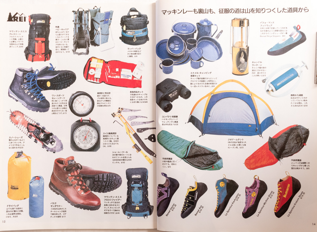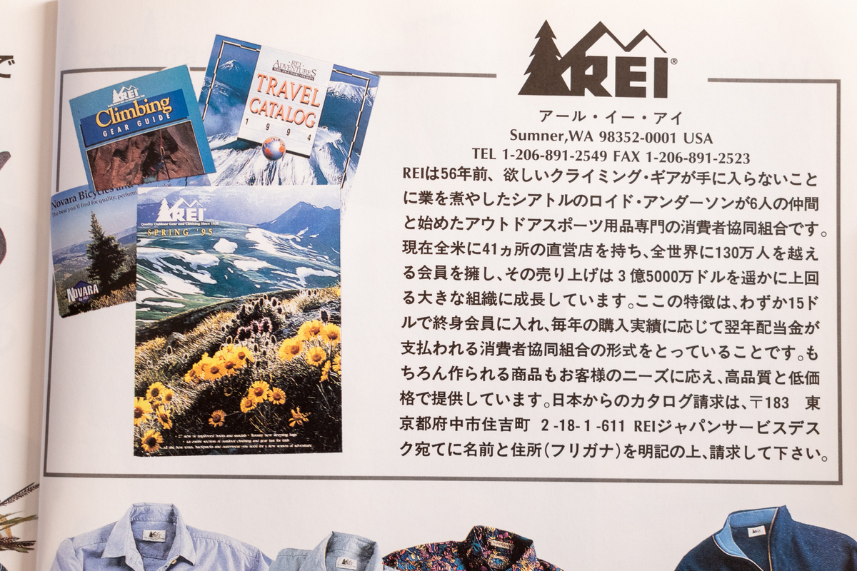 このカタログ概要にもありますが、REIは“アウトドア・スポーツ用品専門の消費者協同組合”です。生協みたいなもんですね。“わずか15ドルで終身会員に入れ、毎年の購入実績に応じて翌年配当金が支払われる”という形式とのこと。今はもうないようですが、日本での問い合わせ窓口が掲載されており、調べてみると一時期は日本に店舗もあったようです。