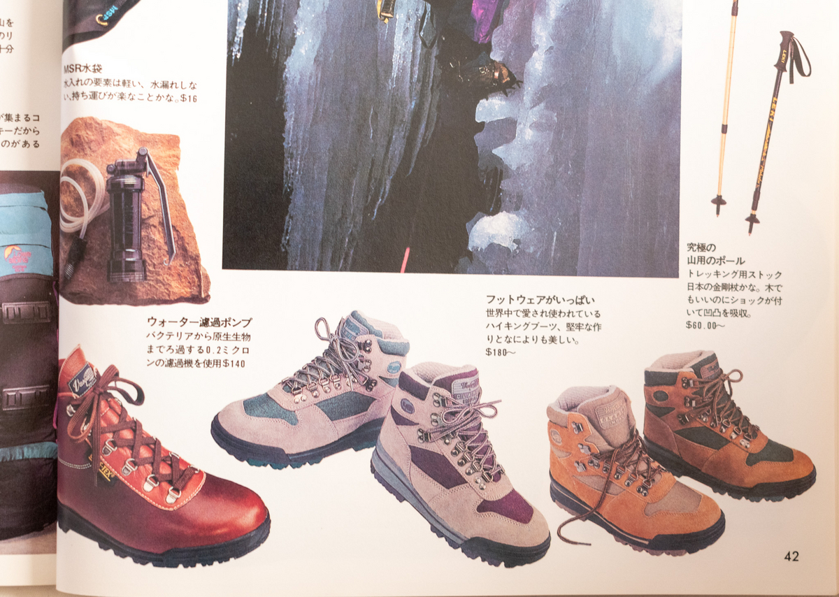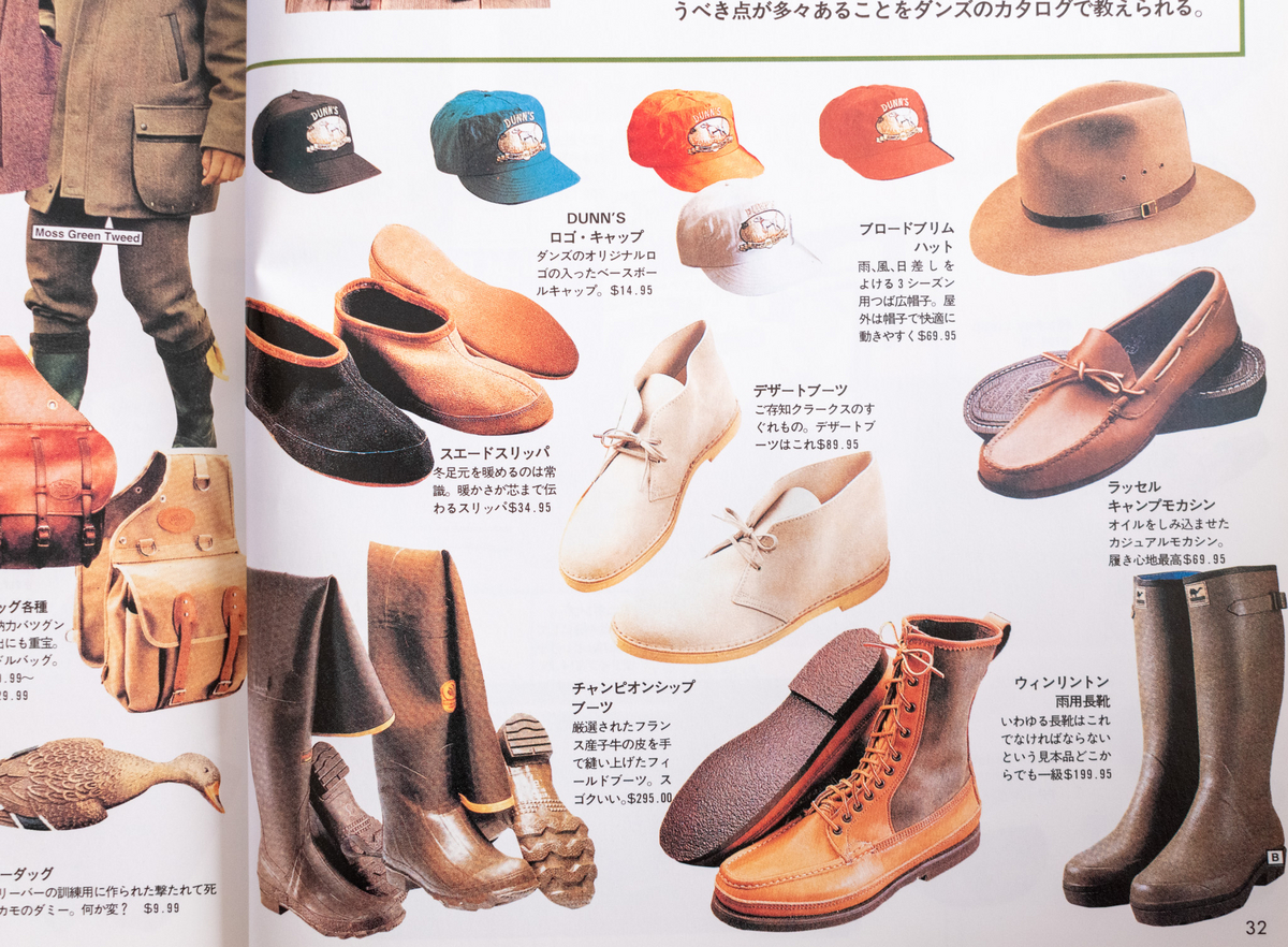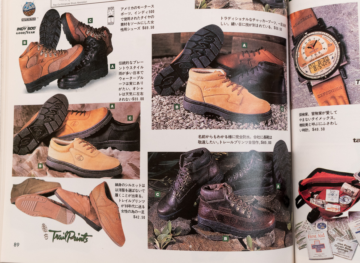 大きく掲載されている“メインハンティングシュー”は、LLビーン創業のきっかけとなったアイテム、ビーンブーツをアレンジしたものでしょうか。この当時人気だったトレッキングシューズとビーンブーツをニコイチにしたようなデザインです。
