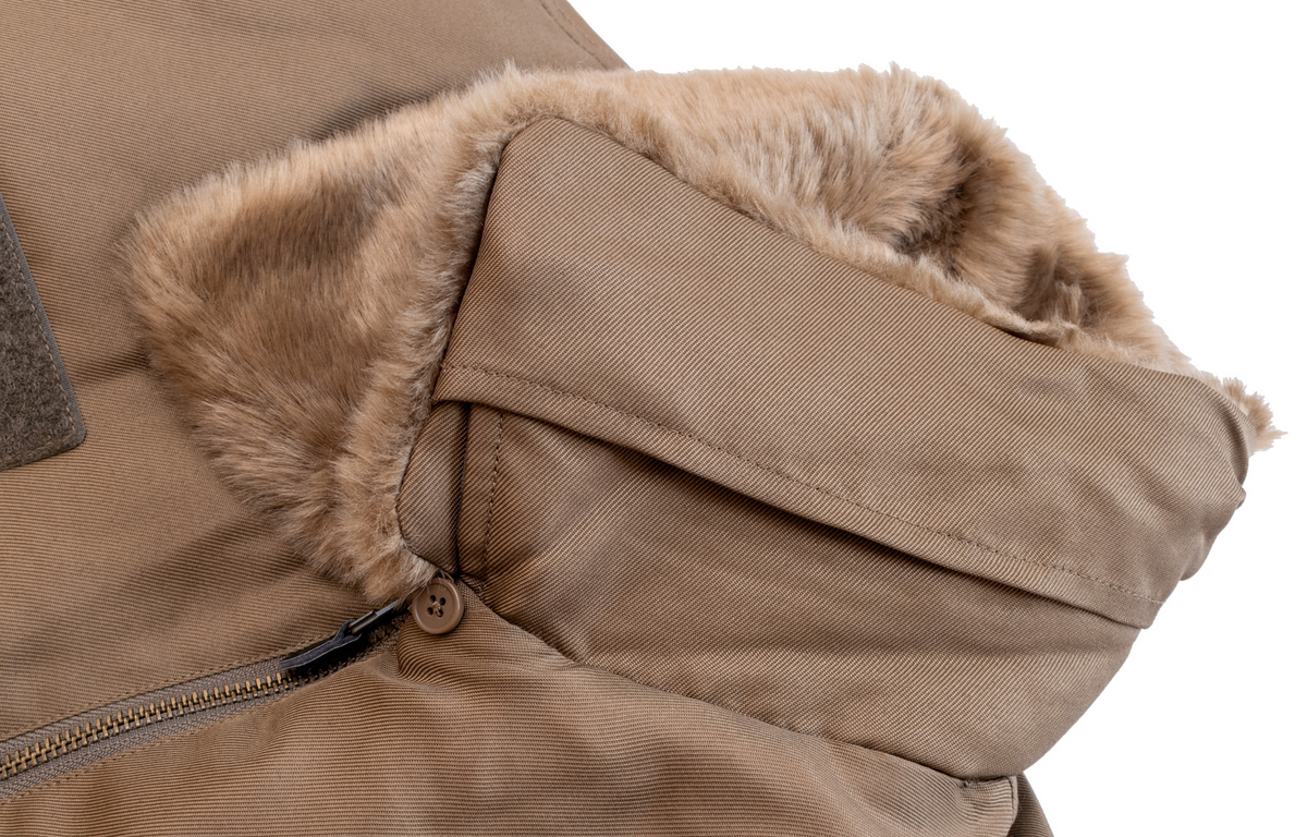 ポケットは、面ファスナーで固定できるようになっているフラップポケットと、手を突っ込んだり、スマートフォンを出し入れするのに便利なハンドウォーマーポケットの二重構造になっています。