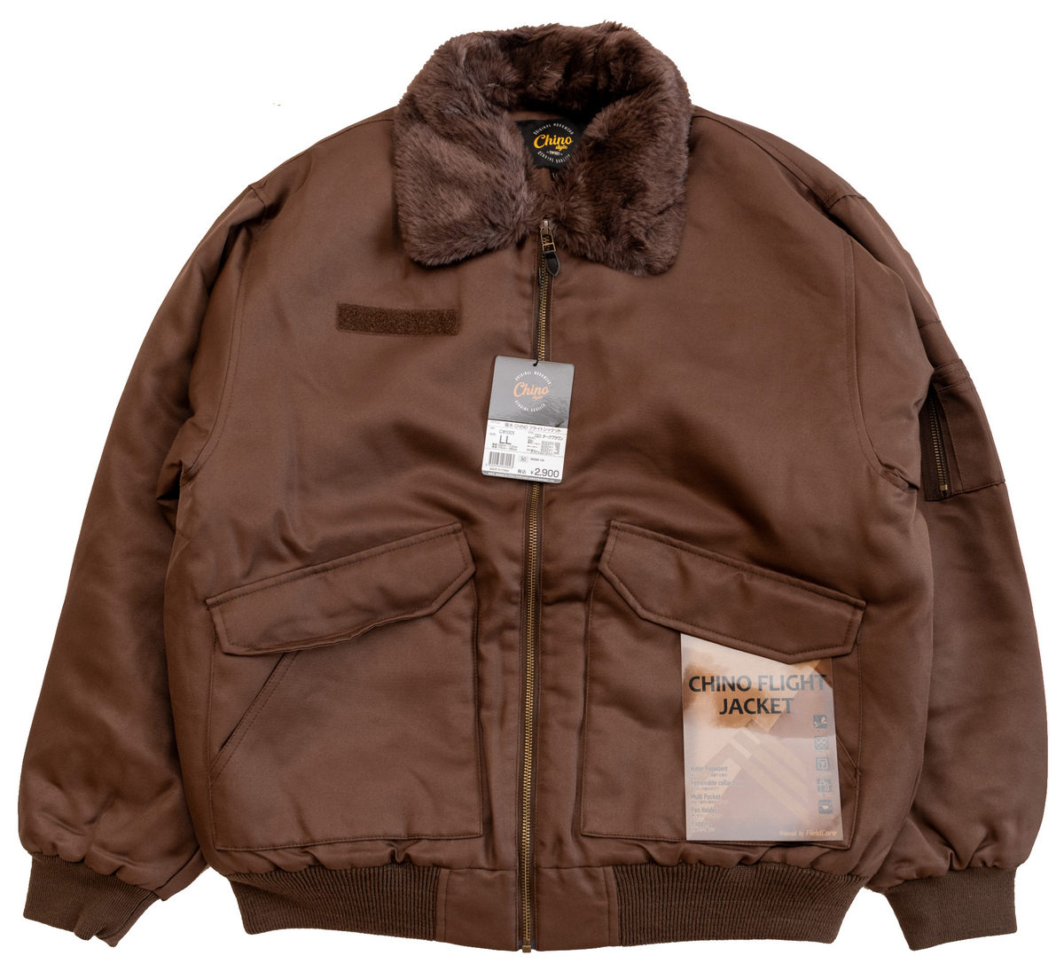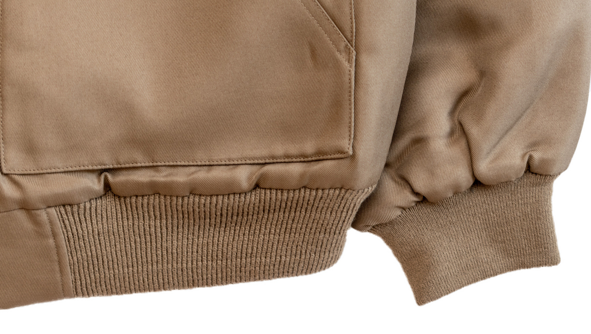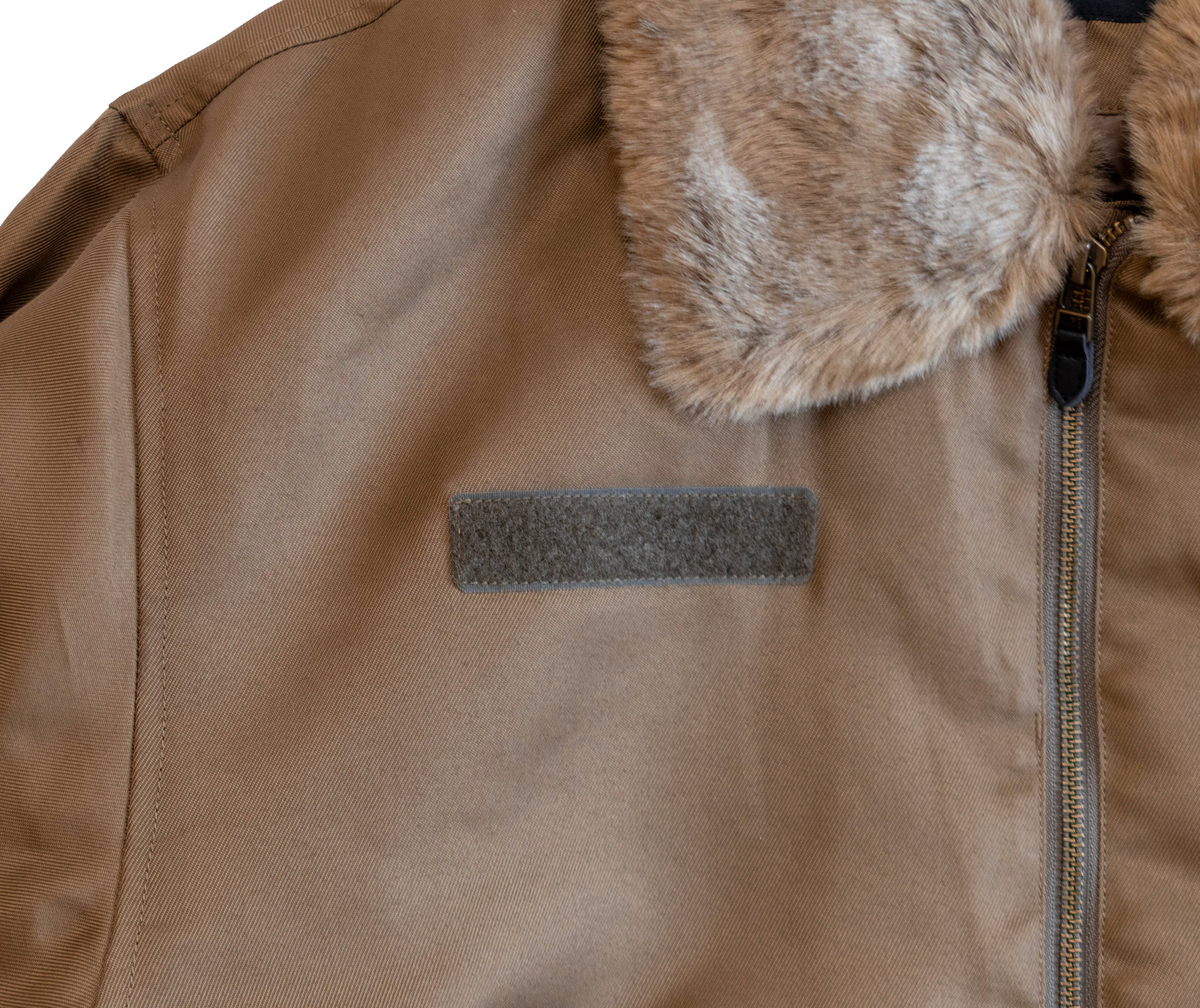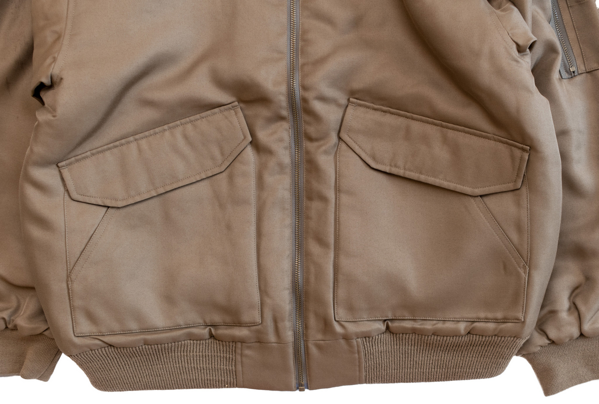 やはり目が行くのは、襟元のボア。フライトジャケットは飛行機の操縦者が着用するミリタリーアイテムですが、高度によっては気温が氷点下になることもあります。なので、着用者の体温を守るために、襟元にボアが設けられていたり、レザー素材が用いられたりと、用途によって様々なモデル、ディティールが存在します。