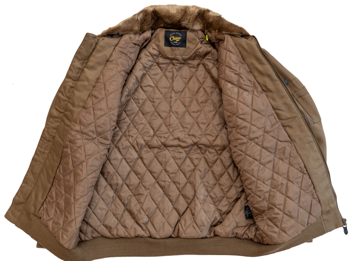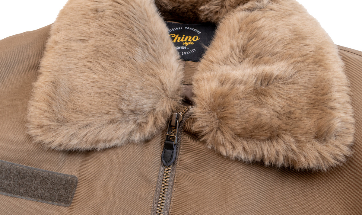 「撥水チノフライトジャケット」の特徴的なディティールである、襟ボア。