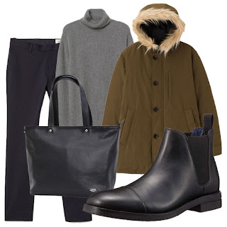 次は細身のチノパンツにタートルネックニット、都会的なデザインのサイドゴアブーツというヨーロピアンな雰囲気の「キレイ目」コーディネートです。ダウンフーディジャケットはややカジュアル度の高いので、他のアイテムはグレーや黒などのものにすると落ち着いた印象のコーディネートになります。