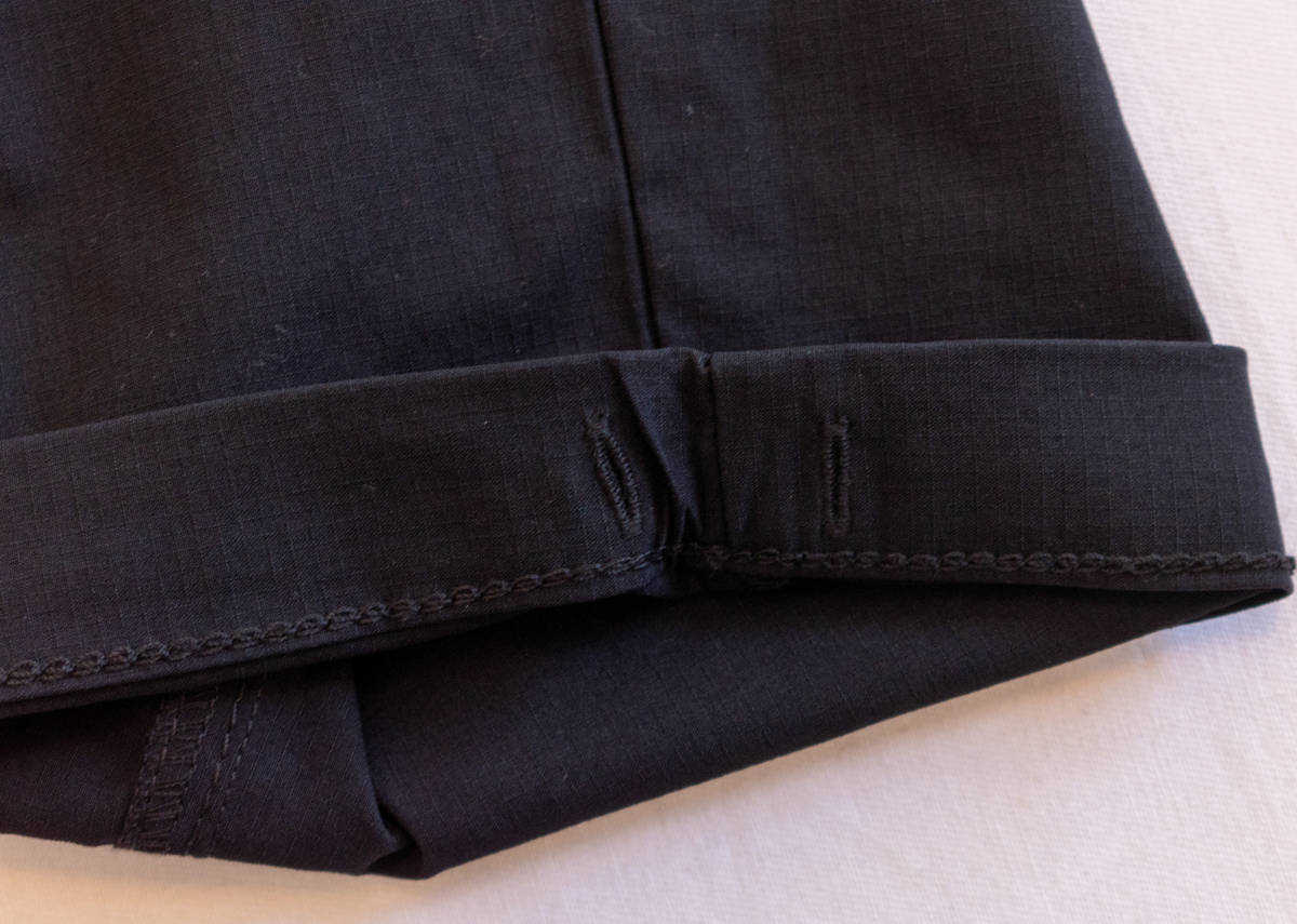 ウエストの後方はゴムになっているので、イージーパンツのように気軽に着用可能。リラックス感があるので、部屋着にも使えます。ベルトループも備えられています。フロントのボタンは二重になっているので、ウエストに負荷がかかったときも外れにくくなっています。