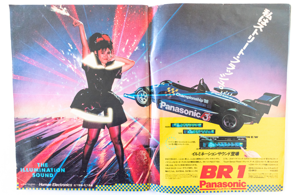 まずはパナソニックのカーオーディオ。“私はストリートフラッシュ”ってなんのことかと思ったら、“モードごとに操作パネルのイルミネーションが変化”するそうです。こういった広告にレーシングカーのF-3が登場するのも、モータースポーツが人気だったバブル期ならでは。