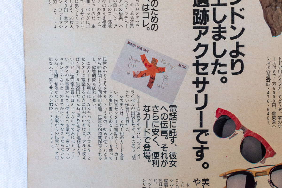 面白かったのが、“伝言センターに電話をして、カードの裏に書いてあるナンバーを使って伝言のやりとりをする”、“聞きたい伝言VAN”という、今では考えられない商品。スマートフォンはおろか、携帯電話もなく、プッシュホンの電話もそれほど普及していなかったのが、1988年でした。