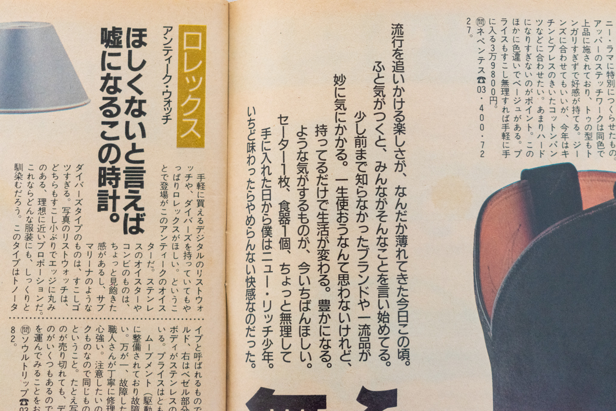 おそらく、この頃の『POPEYE』は新しいファッションを創造することではなく、ステータス性を強調することでマスとの差別化を図っていたのではないでしょうか。