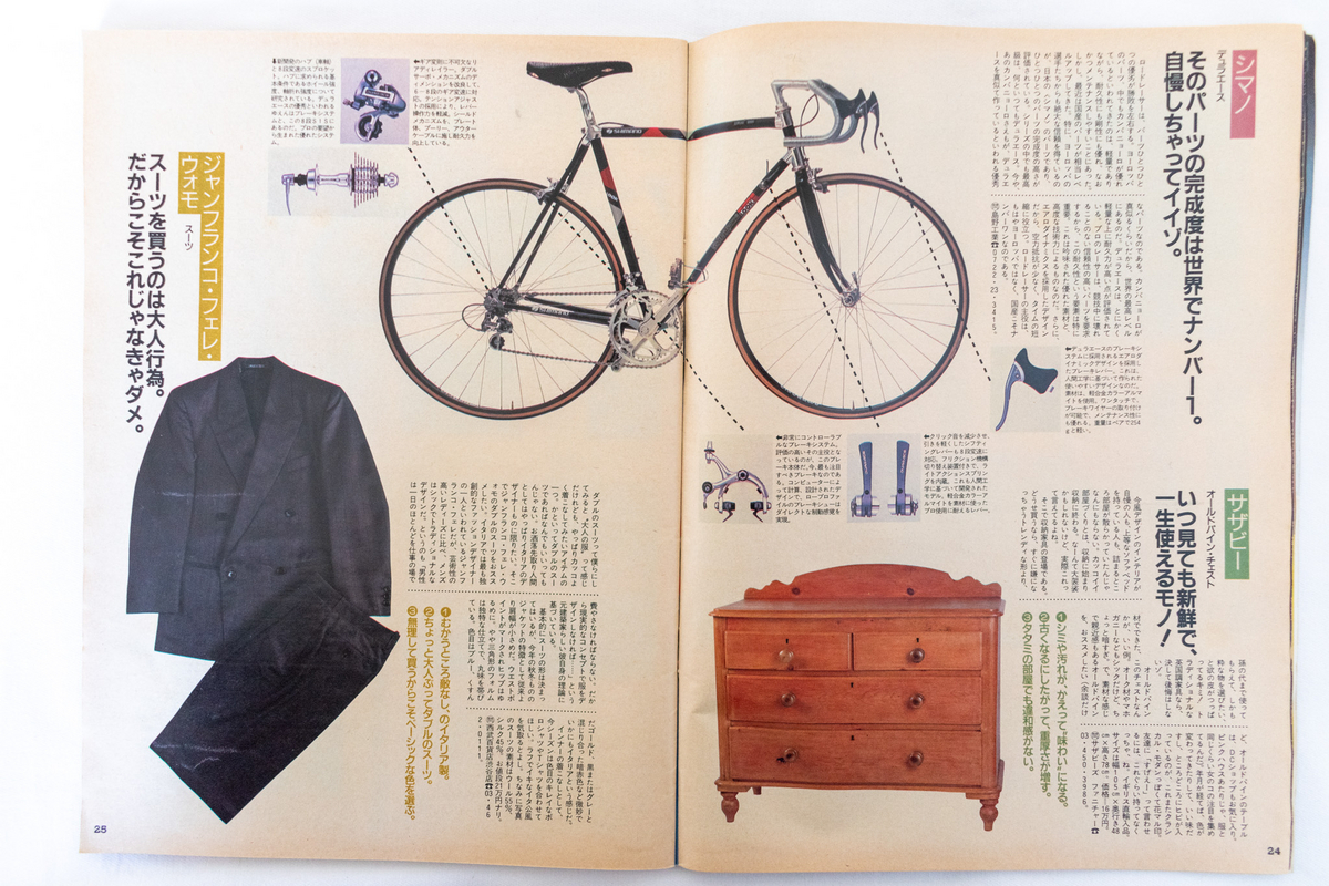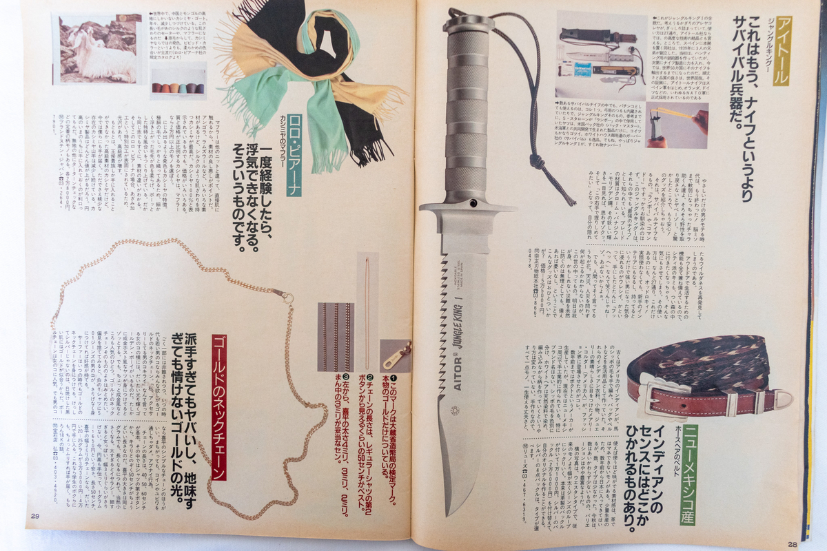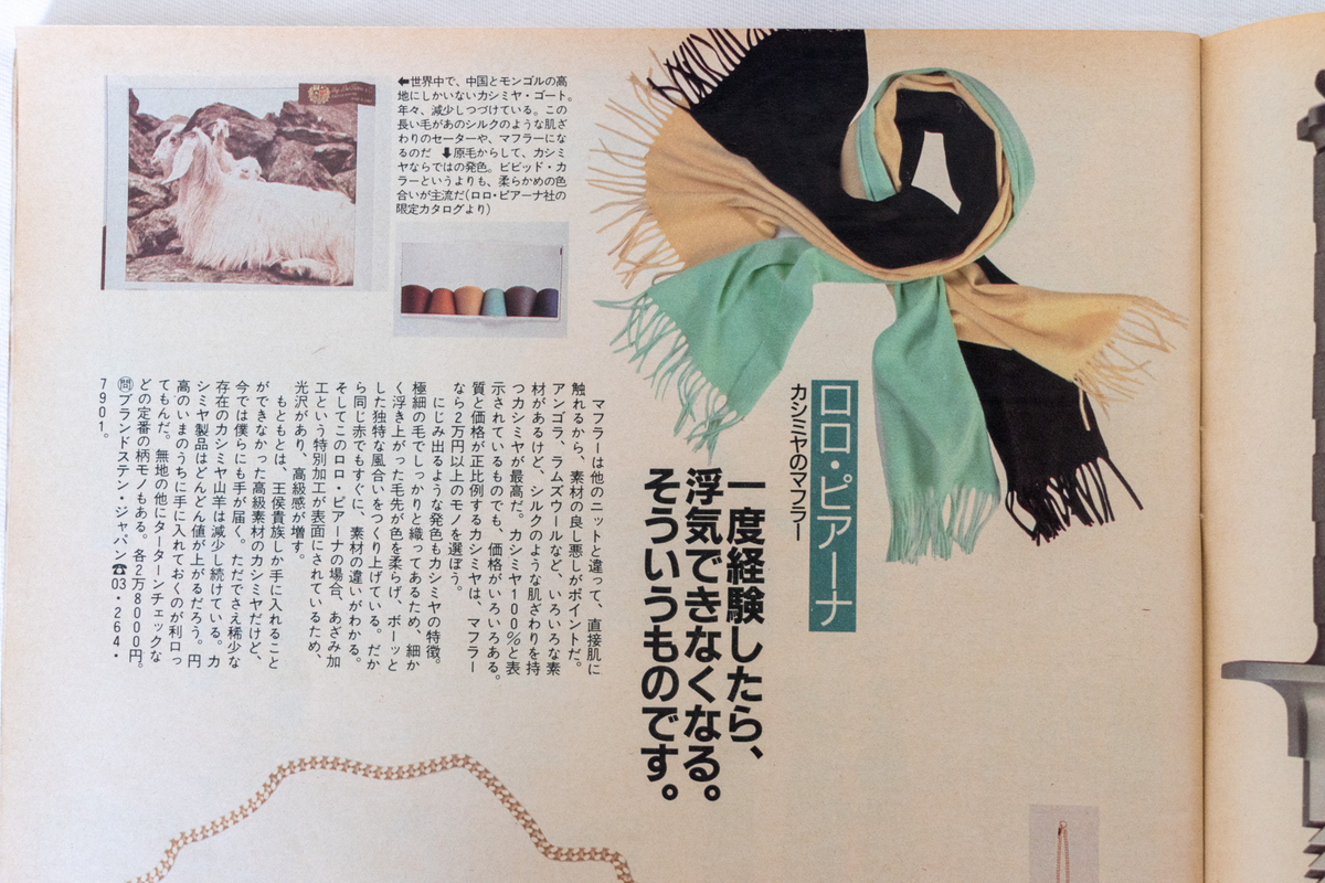 「3G」の一角、ジョルジオ・アルマーニは“ほかのものは高価すぎて手が出ないけどネクタイだったらなんとかなりそうだ”とあり、当時でもやはり高価なアイテムだったことがわかります。