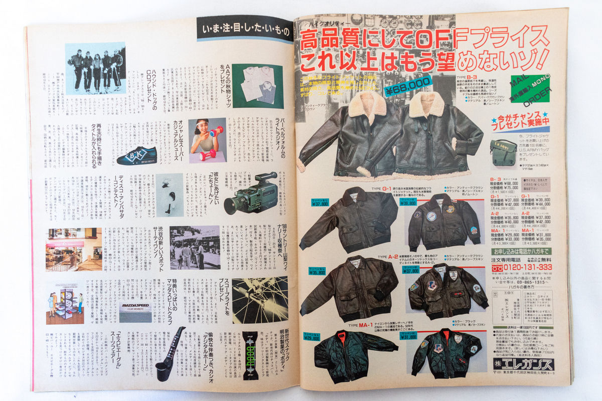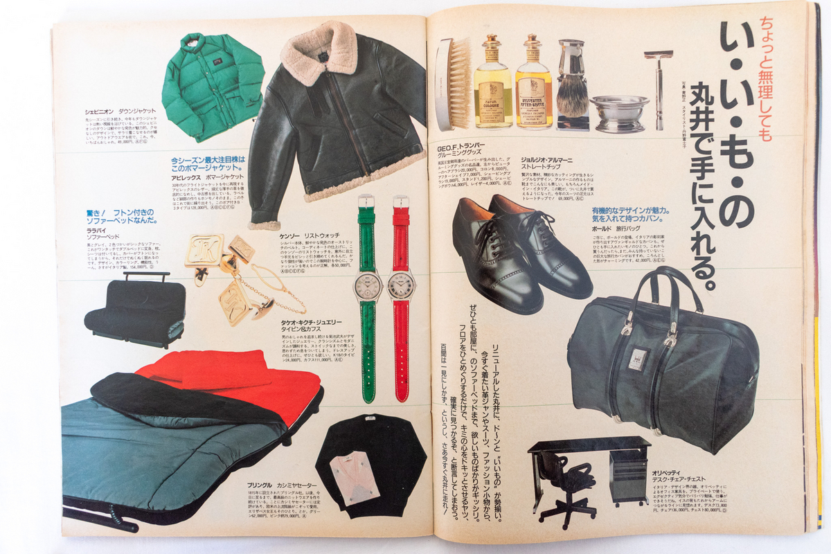 丸井のタイアップページ。1980年代中盤はDCブランドが中心だった丸井でしたが、1988年になるとジョルジオ・アルマーニやフェレなどのイタリアンブランドを打ち出していたようです。