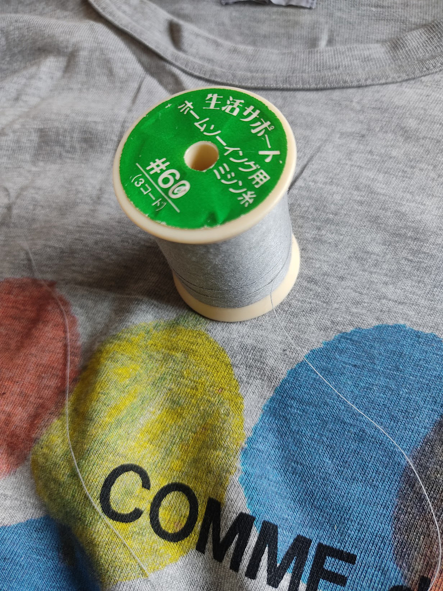 たまたま、このTシャツのボディの色に合う糸が家にありました。糸はユザワヤやオカダヤなどの手芸屋さんはもちろん、最近は100円均一ショップでもかなりのバリエーションが揃うようになっています。