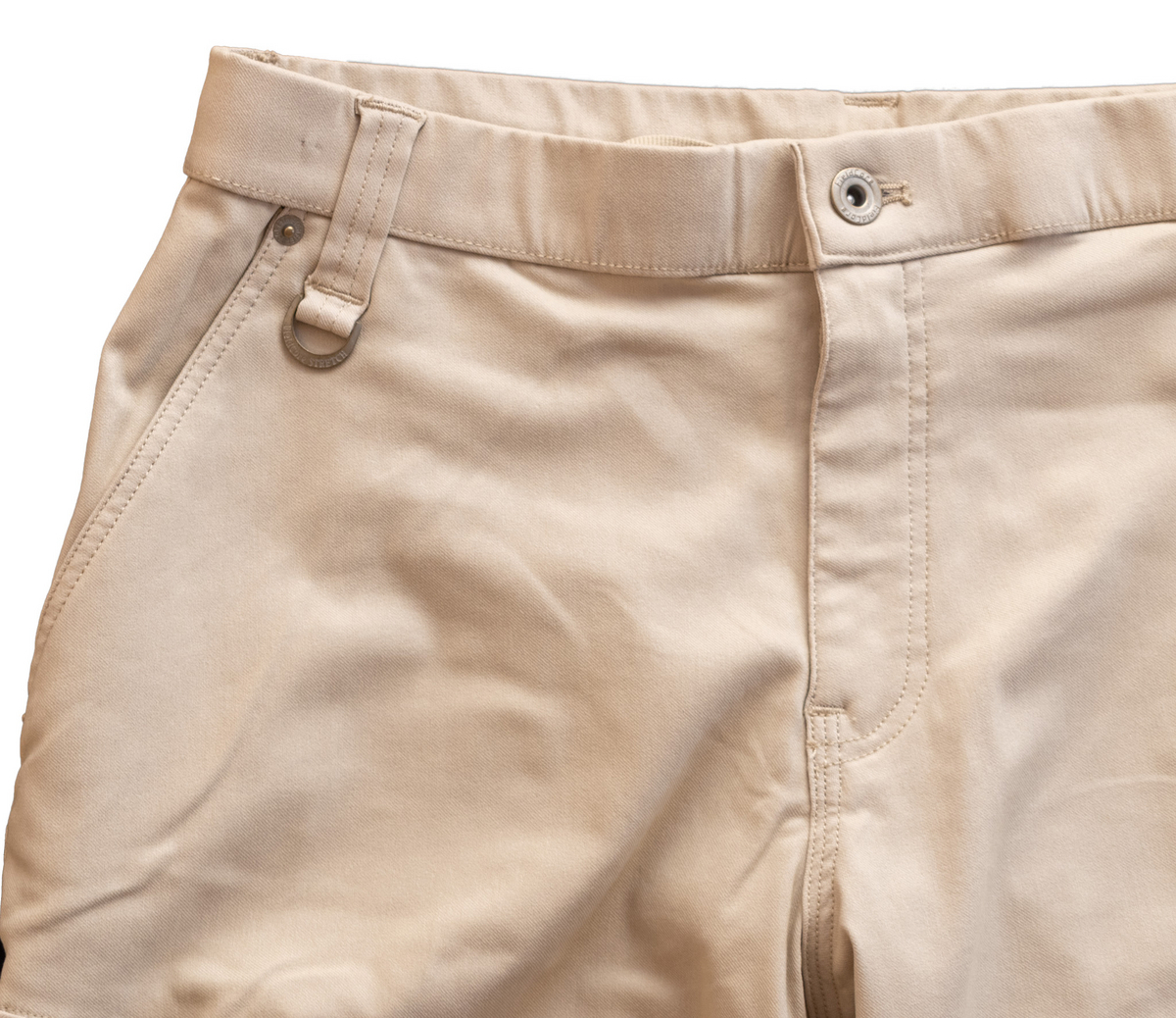 右前方ベルトループにはカラビナループ。ポケットにはリベットが打たれており、ガチワークに耐えうる強度が確保されています。