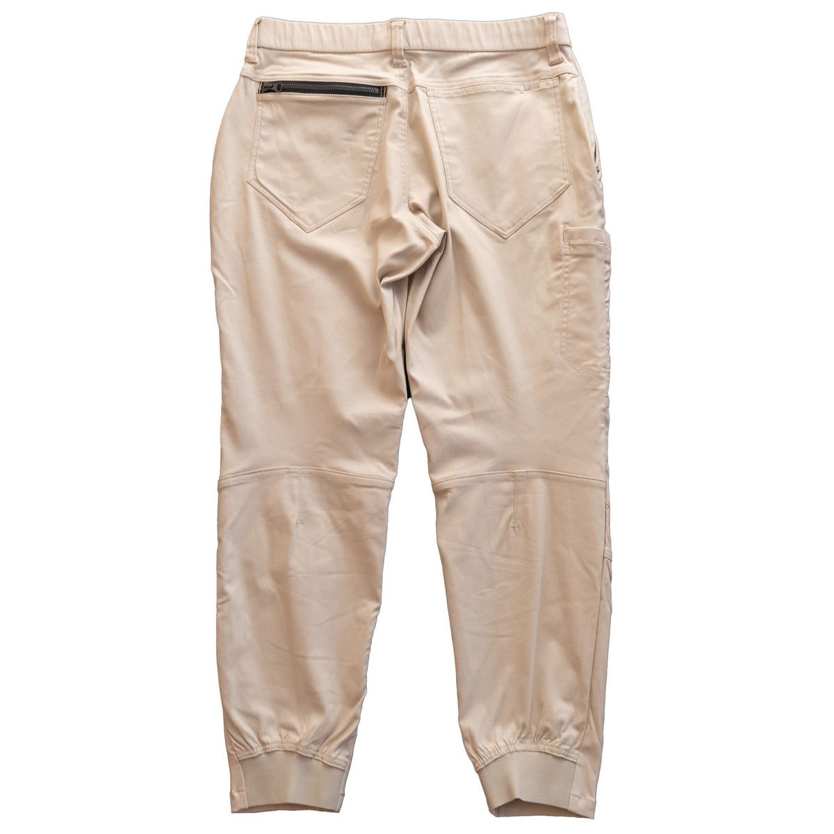 こちら、後ろ側から見るとこの通り、リブが配されています。これは現場作業のときに裾の引っ掛かりを防ぐためのディティールです。「エアロストレッチウォームジョガーパンツ」が、プロの現場で愛用されるのも、こういったディティールがあるからこそです。
