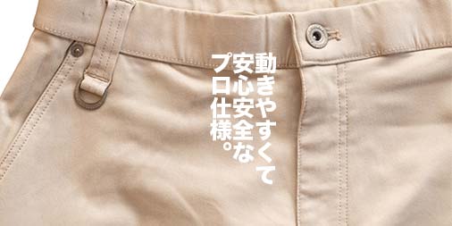 基本的な機能は「エアロストレッチウォームスラックス」と同じです。高ストレッチの他にも撥水機能や花粉やホコリが付きにくい加工など、現場ではもちろん日常生活でも役立つ機能が満載です。