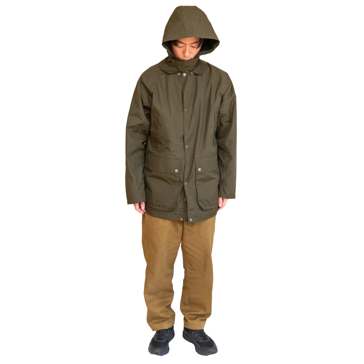 176cm65kgでLLサイズを着用。個人的には、このフードを付けた状態だとレインウェアとしても活躍してくれるので、最も使い勝手いいと思っています。