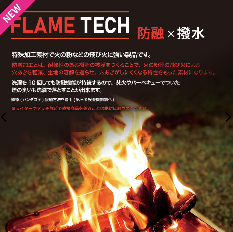 「モンスターパーカー」を筆頭に、2022年秋冬でも数多くの製品が展開されている、火の粉が飛んでも穴が空きにくい防融素材のフレイムテック。