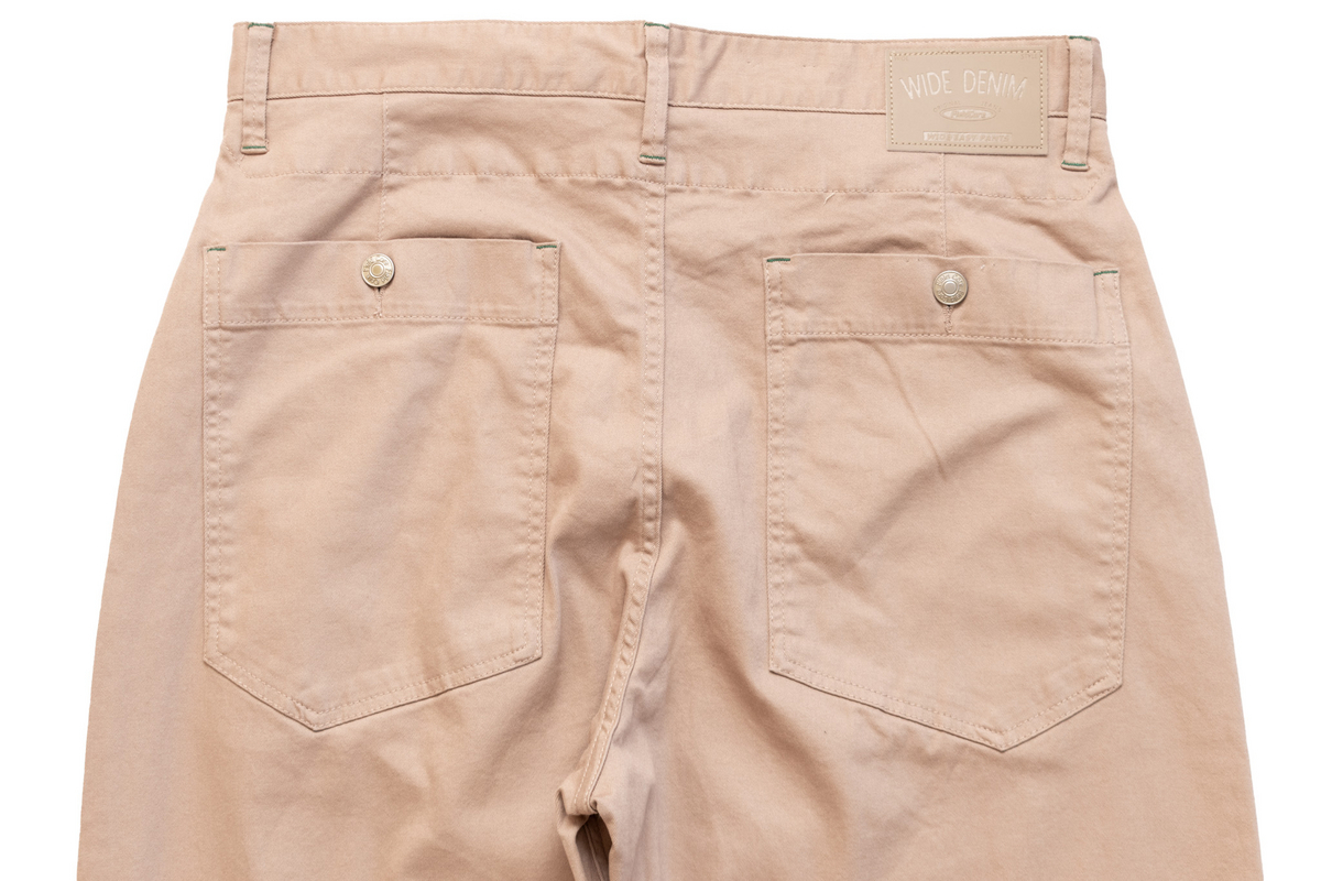「グリーンテック ワイドフィットウォーミーデニムパンツ」の特徴は、やはりこのゆったりとしたシルエット。こうやって全体を見るとよくわかりますが、ウエストから太もも部分に向けて広がり、膝から裾にかけて緩やかに細くなっています。