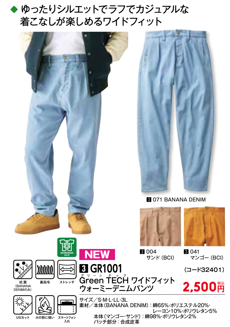 ワークマン×山田耕史共同開発「グリーンテック ワイドフィットウォーミーデニムパンツ」です。