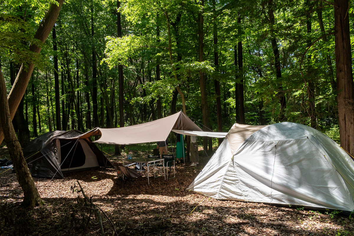 キャンプ場に着くと早速、僕、妻、友人夫婦の大人4人で、「ワイドミシックドームテントAG」2張とタープの設営を開始。