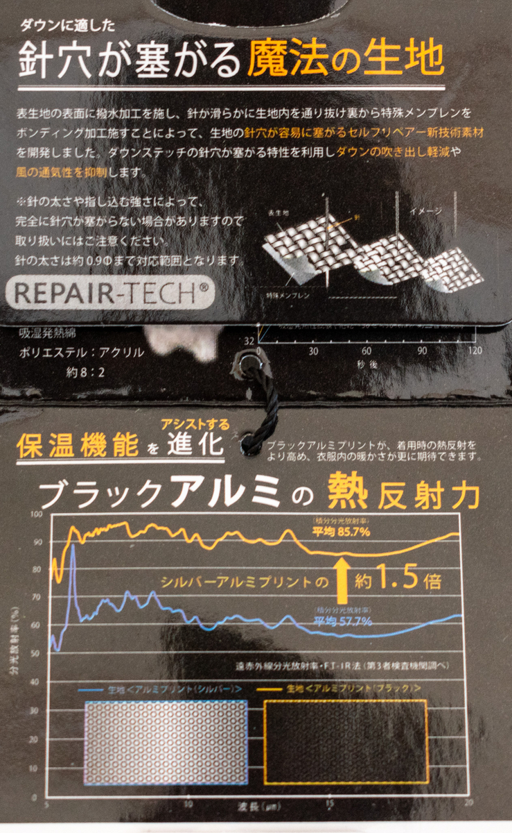天然ダウンに発熱わたをミックスしたフュージョンダウンプラス、保温力を高めるブラックアルミプリント、撥水加工、パッカブルで気軽に持ち運べる収納袋も付属しています。