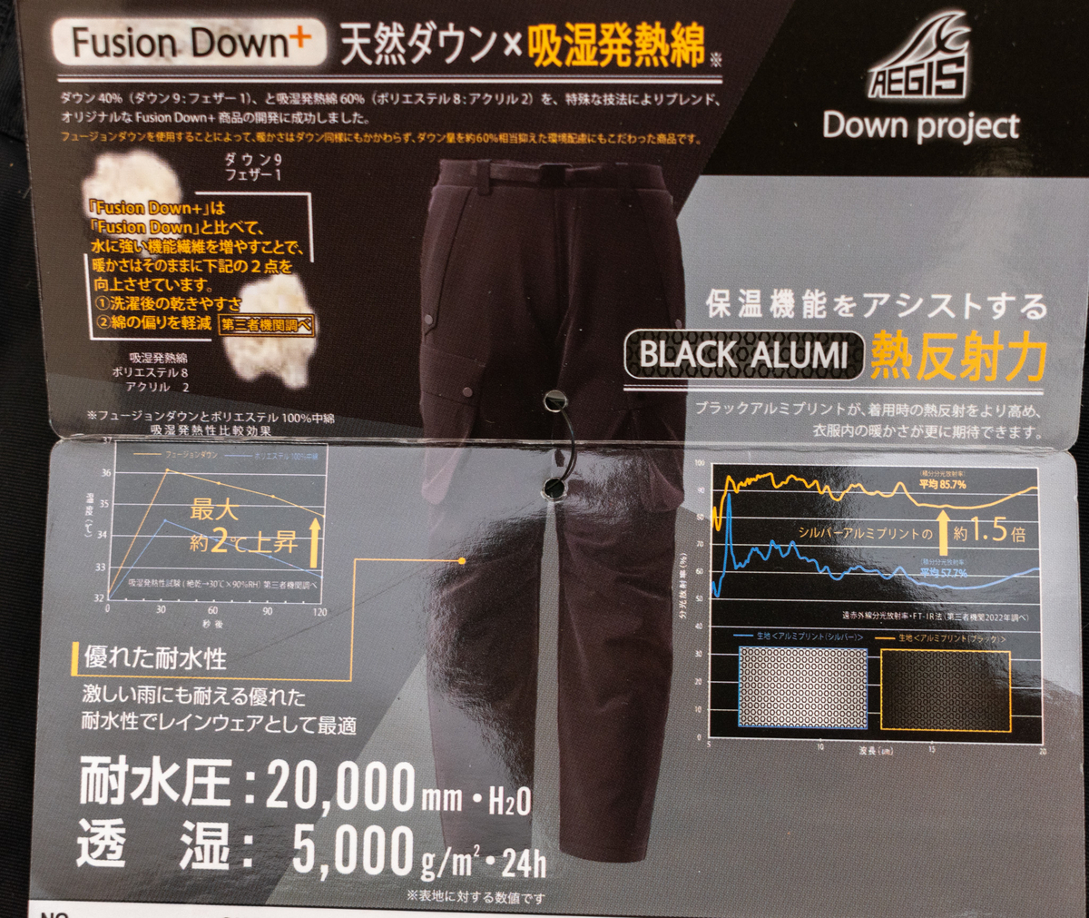防水力がウリのイージスブランドの製品である、ワークマン×山田耕史「イージスフュージョンダウンパンツ」。フュージョンダウンやブラックアルミプリントに加え、耐水圧20,000mm、透湿度5,000g/m2/24hという、防水透湿性が魅力。
